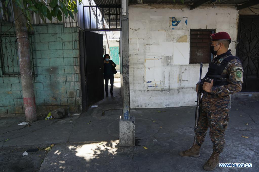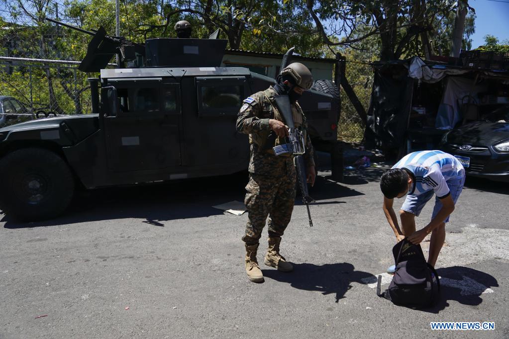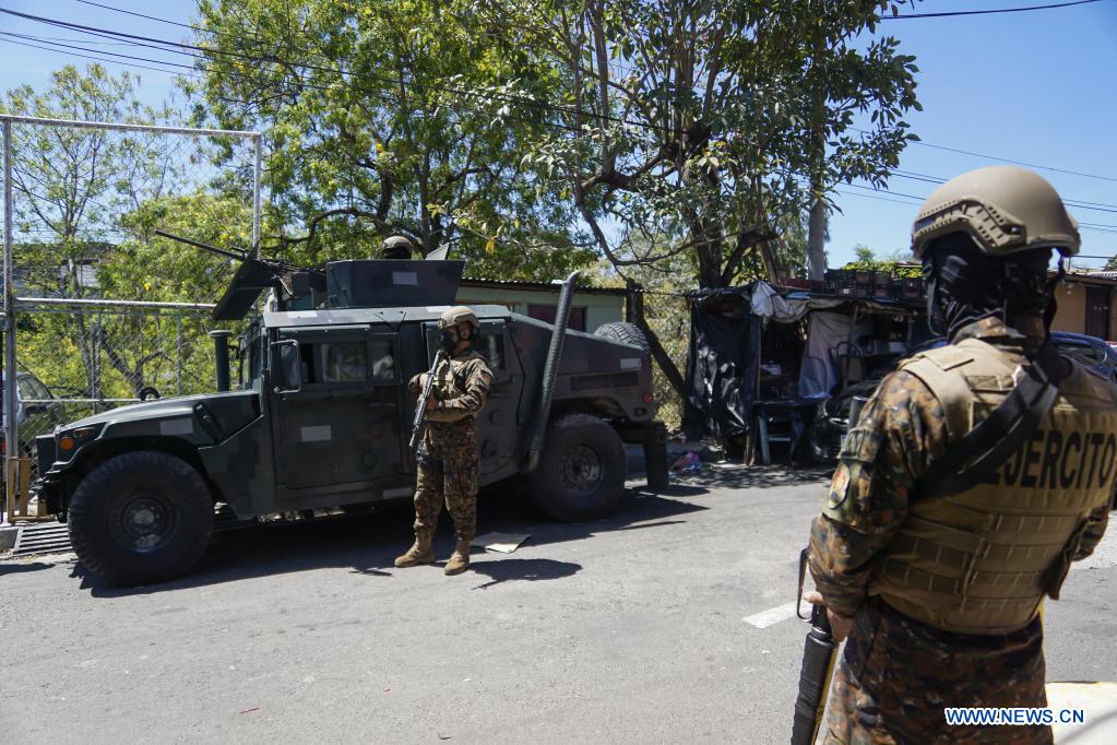 SAN SALVADOR, 27 marzo, 2022 (Xinhua) -- Soldados del Ejército salvadoreño vigilan durante un operativo de seguridad, en el departamento de San Salvador, El Salvador, el 27 de marzo de 2022. La Asamblea Legislativa de El Salvador aprobó el domingo la solicitud del presidente Nayib Bukele para establecer un régimen de excepción ante una oleada de homicidios que aqueja al país. (Xinhua/Alexander Peña)