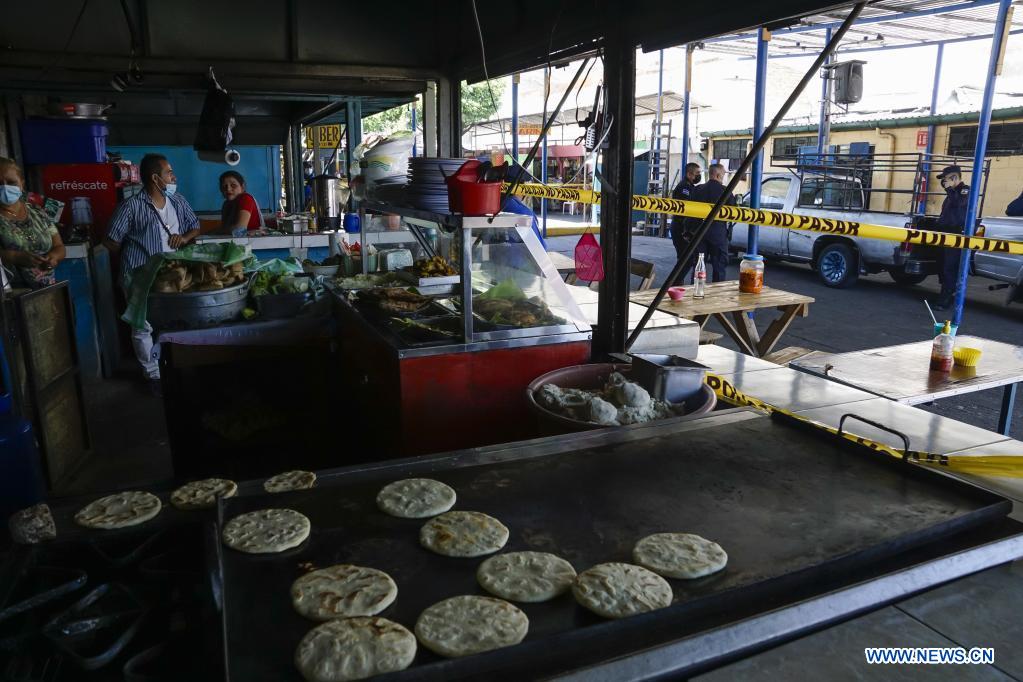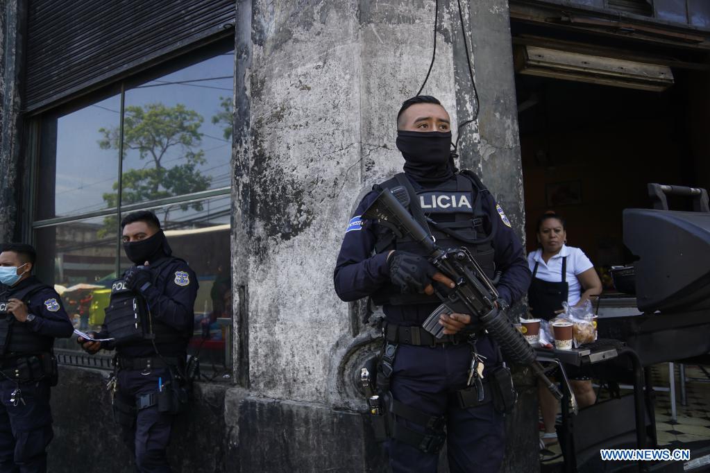 SAN SALVADOR, 27 marzo, 2022 (Xinhua) -- Agentes de la Policía Nacional Civil salvadoreña vigilan en el sitio donde se registró un homicidio, en el Centro Histórico del departamento de San Salvador, El Salvador, el 27 de marzo de 2022. La Asamblea Legislativa de El Salvador aprobó el domingo la solicitud del presidente Nayib Bukele para establecer un régimen de excepción ante una oleada de homicidios que aqueja al país. (Xinhua/Alexander Peña)