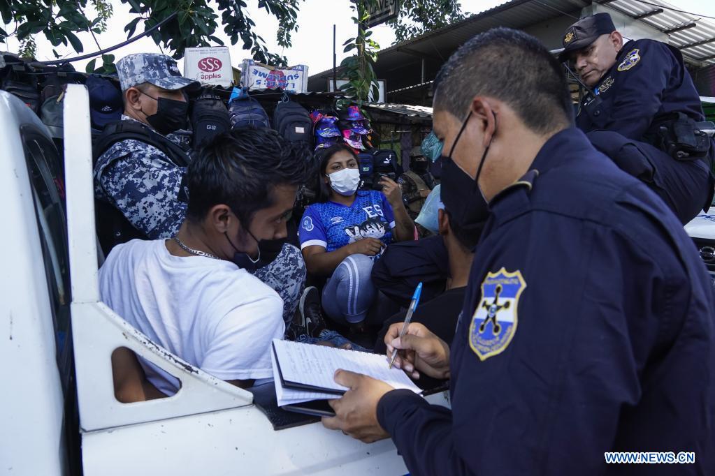 SAN SALVADOR, 28 marzo, 2022 (Xinhua) -- Un agente de la Policía Nacional Civil (PNC) salvadoreña revisa a personas durante un operativo de seguridad, en el departamento de San Salvador, El Salvador, el 28 de marzo de 2022. La policía salvadoreña detuvo el pasado fin de semana a 576 presuntos pandilleros, como parte de las acciones para enfrentar la ola de muertes violentas en el país centroamericano, confirmó el lunes la PNC de El Salvador. (Xinhua/Alexander Peña)