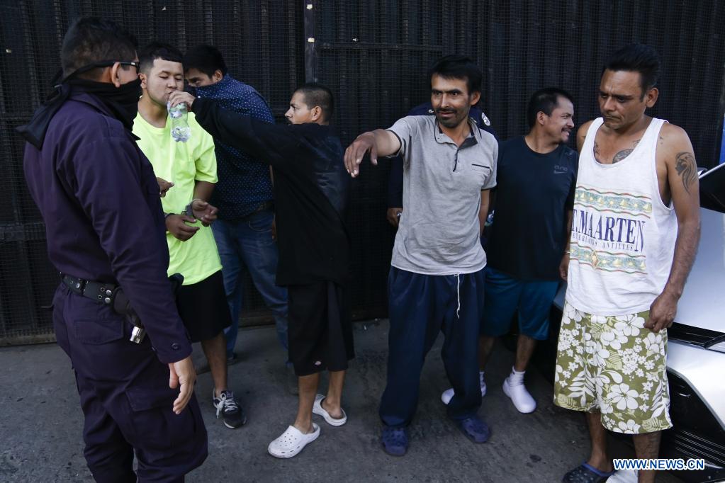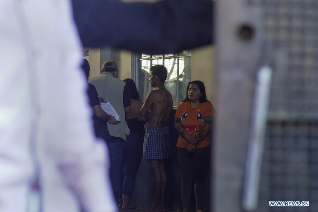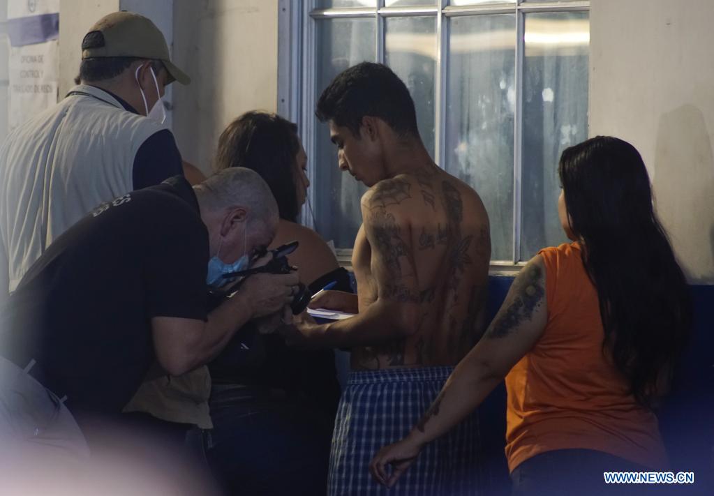 SAN SALVADOR, 29 marzo, 2022 (Xinhua) -- Un agente de la Policía Nacional Civil salvadoreña vigila personas detenidas durante un operativo de seguridad, en el departamento de San Salvador, El Salvador, el 29 de marzo de 2022. La Asamblea Legislativa de El Salvador aprobó la solicitud del presidente Nayib Bukele para establecer un régimen de excepción ante una oleada de homicidios que aqueja al país. (Xinhua/Alexander Peña)