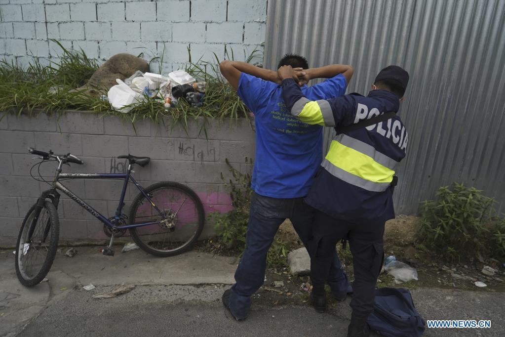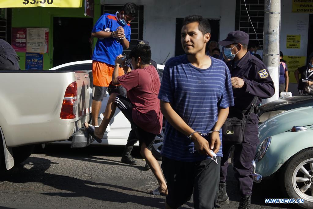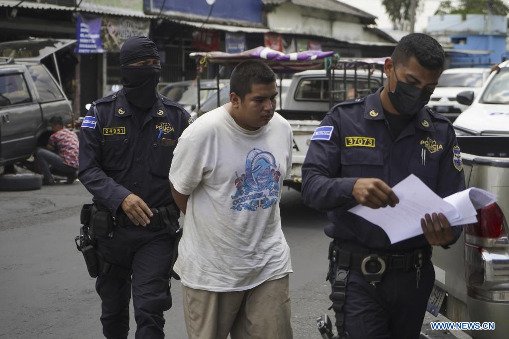 SAN SALVADOR, 29 marzo, 2022 (Xinhua) -- Agentes de la Policía Nacional Civil salvadoreña vigilan a una persona detenida durante un operativo de seguridad, en el departamento de San Salvador, El Salvador, el 29 de marzo de 2022. La Asamblea Legislativa de El Salvador aprobó la solicitud del presidente Nayib Bukele para establecer un régimen de excepción ante una oleada de homicidios que aqueja al país. (Xinhua/Alexander Peña)