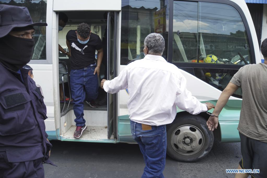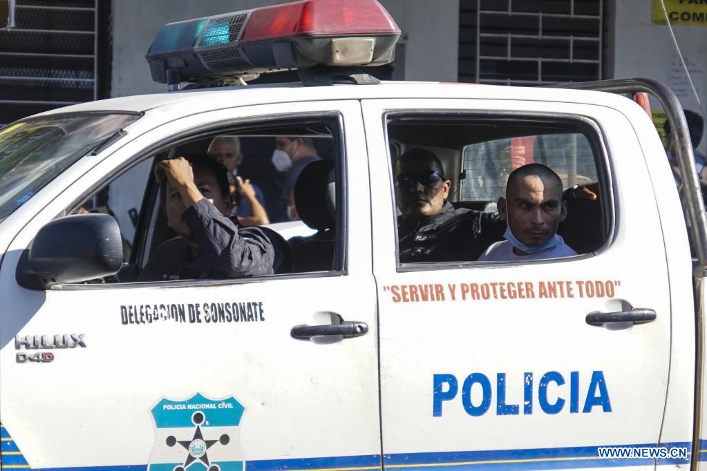 SAN SALVADOR, 28 marzo, 2022 (Xinhua) -- Agentes de la Policía Nacional Civil (PNC) salvadoreña trasladan a bordo de un vehículo a una persona durante un operativo de seguridad, en el departamento de San Salvador, El Salvador, el 28 de marzo de 2022. La policía salvadoreña detuvo el pasado fin de semana a 576 presuntos pandilleros, como parte de las acciones para enfrentar la ola de muertes violentas en el país centroamericano, confirmó el lunes la PNC de El Salvador. (Xinhua/Alexander Peña)