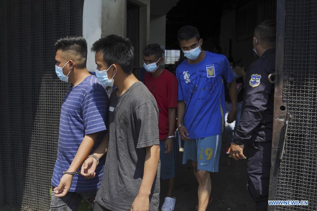 SAN SALVADOR, 29 marzo, 2022 (Xinhua) -- Un agente de la Policía Nacional Civil salvadoreña vigila a personas detenidas durante un operativo de seguridad, en el departamento de San Salvador, El Salvador, el 29 de marzo de 2022. La Asamblea Legislativa de El Salvador aprobó la solicitud del presidente Nayib Bukele para establecer un régimen de excepción ante una oleada de homicidios que aqueja al país. (Xinhua/Alexander Peña)