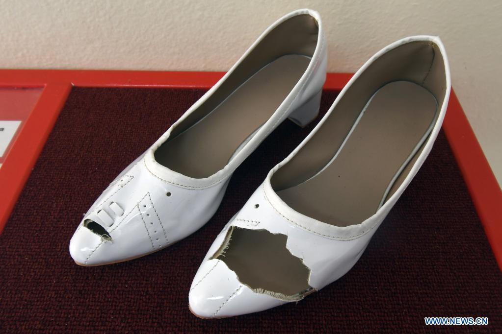 MATANZAS, 3 abril, 2022 (Xinhua) -- Imagen del 30 de marzo de 2022 de una copia del par de zapatos blancos agujereados de la campesina Nemesia Rodríguez, quien actualmente tiene 75 años de edad, exhibidos en el Museo de Playa Girón, en Matanzas, Cuba. El museo, abierto en 1976, conserva casi un millar de objetos vinculados a la batalla que se llevó a cabo en esa zona, entre ellos armas, documentos y fotografías. (Xinhua/Joaquín Hernández)