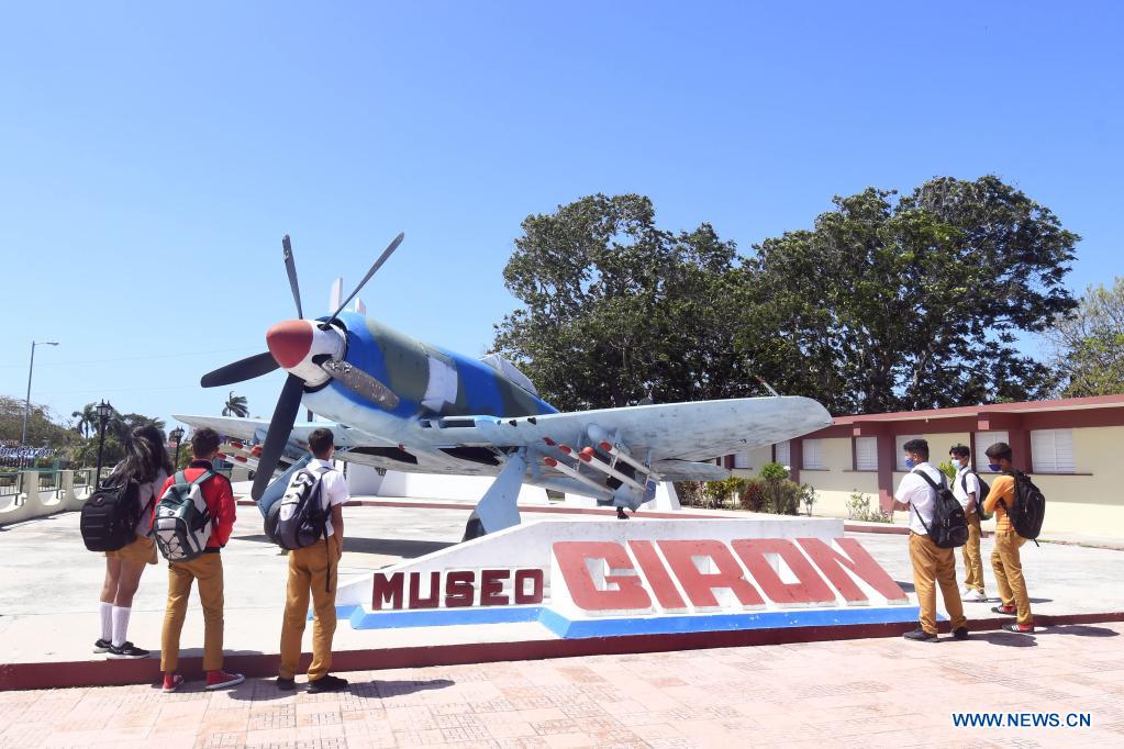 MATANZAS, 3 abril, 2022 (Xinhua) -- Imagen del 30 de marzo de 2022 de jóvenes estudiantes observando un avión de combate exhibido en el Museo de Playa Girón, en Matanzas, Cuba. El museo, abierto en 1976, conserva casi un millar de objetos vinculados a la batalla que se llevó a cabo en esa zona, entre ellos armas, documentos y fotografías. (Xinhua/Joaquín Hernández)