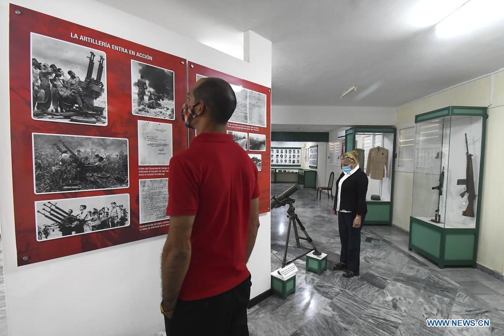 MATANZAS, 3 abril, 2022 (Xinhua) -- Imagen del 30 de marzo de 2022 de personas observando fotografías exhibidas en el Museo de Playa Girón, en Matanzas, Cuba. El museo, abierto en 1976, conserva casi un millar de objetos vinculados a la batalla que se llevó a cabo en esa zona, entre ellos armas, documentos y fotografías. (Xinhua/Joaquín Hernández)