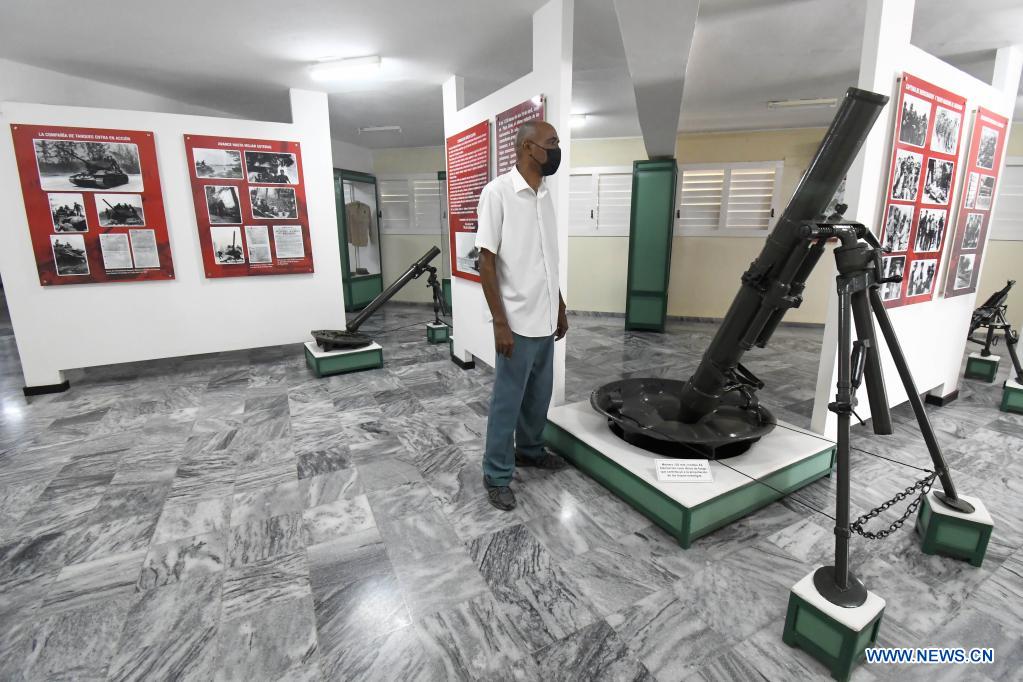 MATANZAS, 3 abril, 2022 (Xinhua) -- Imagen del 30 de marzo de 2022 de un hombre observando un armamento exhibido en el Museo de Playa Girón, en Matanzas, Cuba. El museo, abierto en 1976, conserva casi un millar de objetos vinculados a la batalla que se llevó a cabo en esa zona, entre ellos armas, documentos y fotografías. (Xinhua/Joaquín Hernández)
