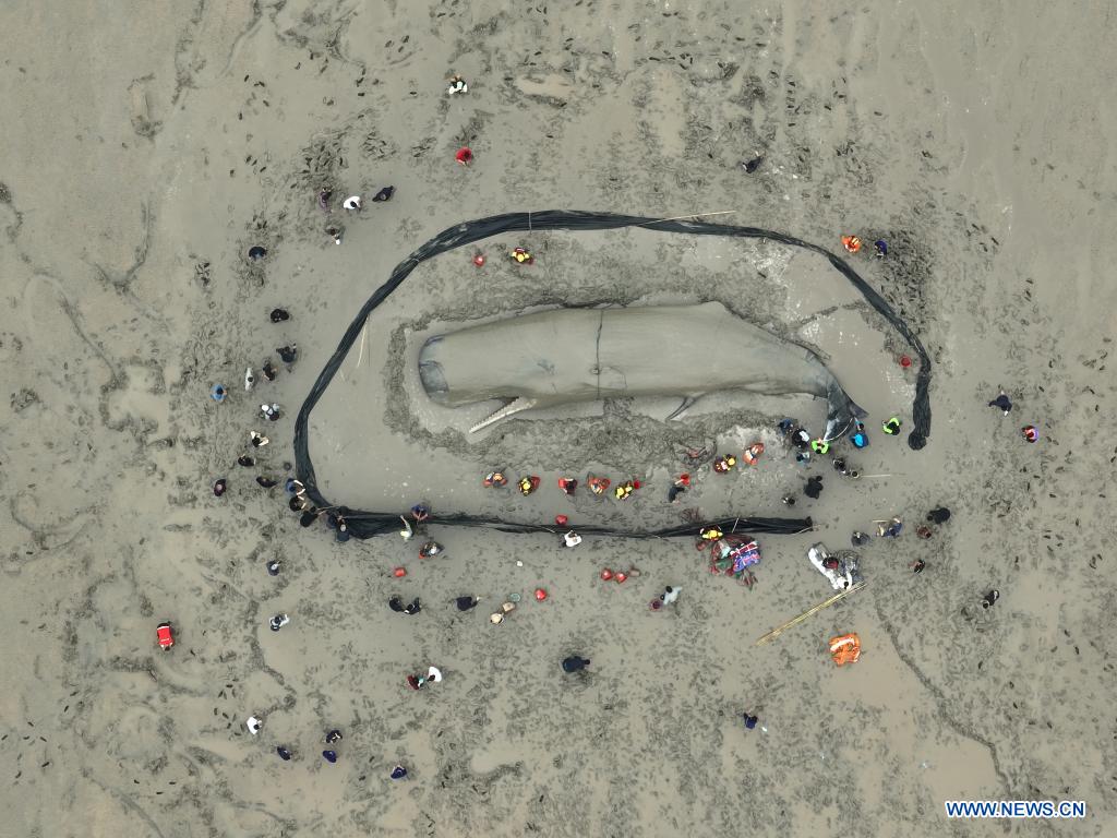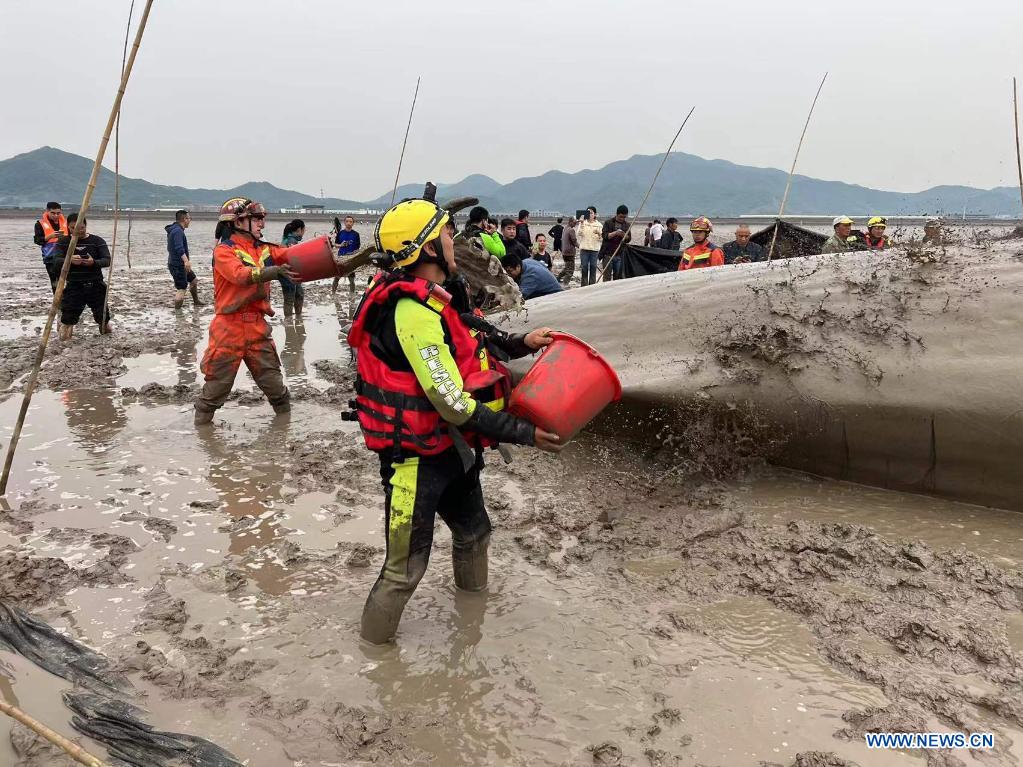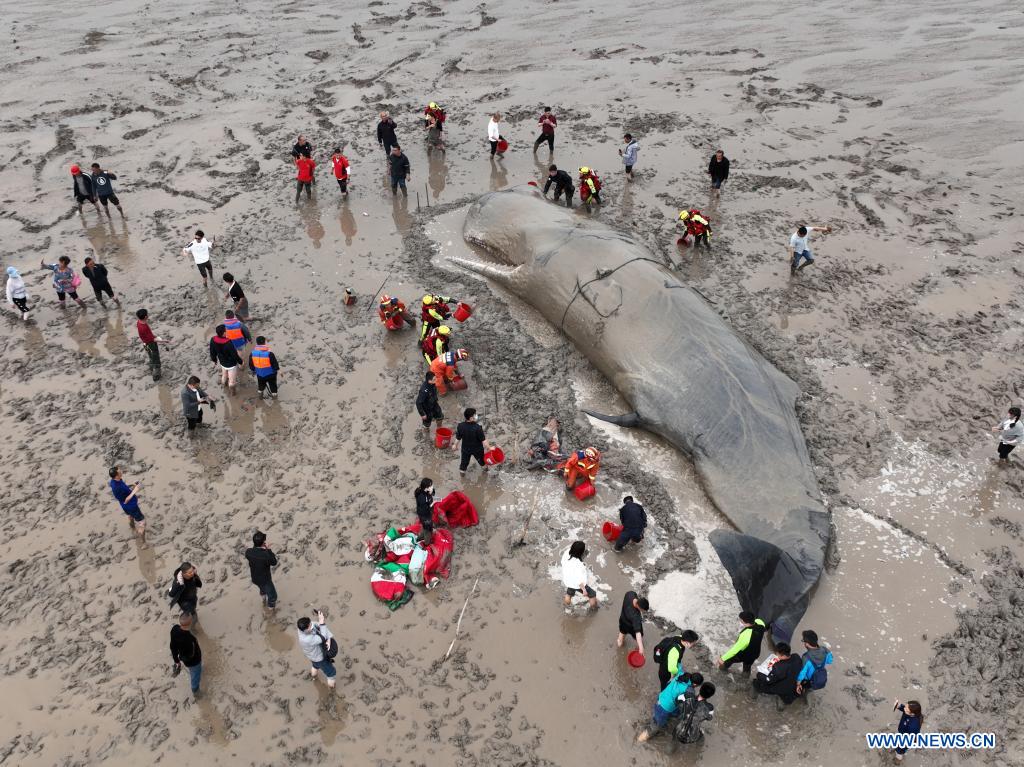 HANGZHOU, 20 abr (Xinhua) -- Tras 20 horas de operaciones de rescate, los rescatistas evacuaron hacia aguas profundas a una ballena que quedó varada en tierra, en la provincia oriental china de Zhejiang.