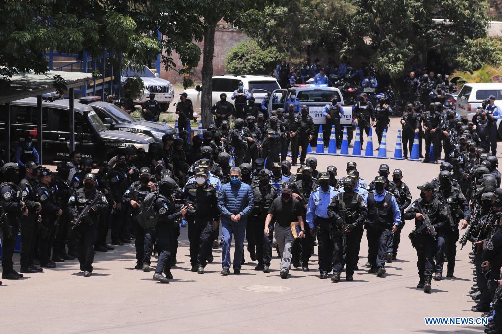 El ex presidente de Honduras, Juan Orlando Hernández (c), es escoltado por autoridades hondureñas para su extradición a Estados Unidos en las instalaciones de la Dirección Nacional de Fuerzas Especiales, en Tegucigalpa, Honduras, el 21 de abril de 2022. Hernández fue extraditado el jueves hacia Estados Unidos, donde es acusado de narcotráfico. (Xinhua/Rafael Ochoa)