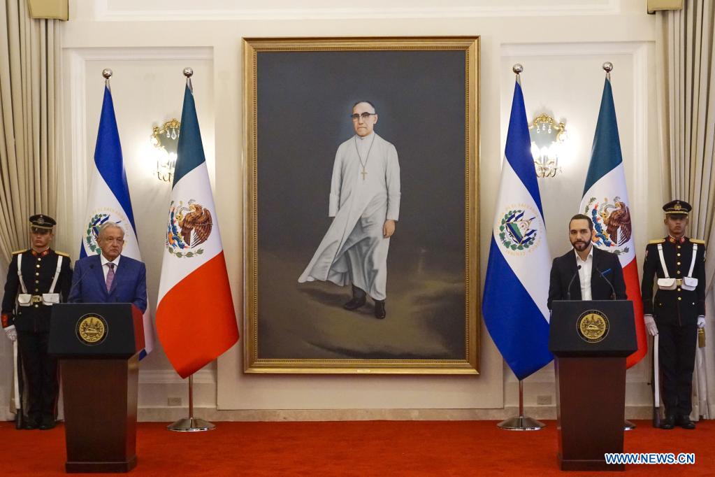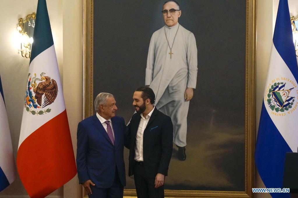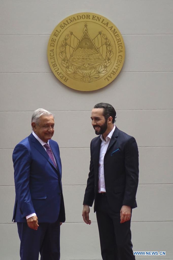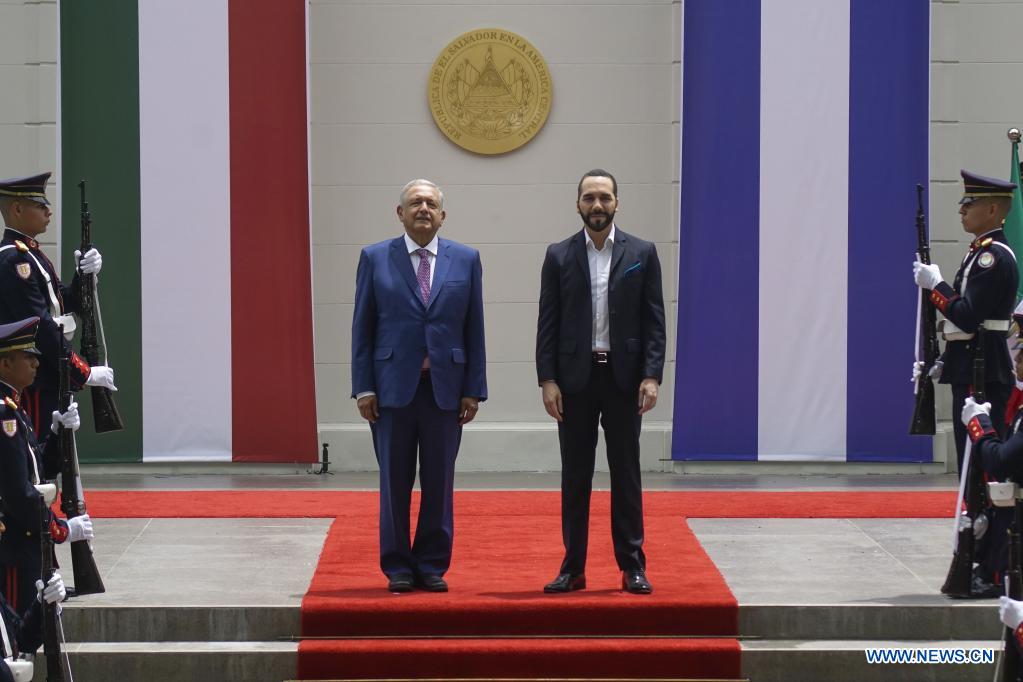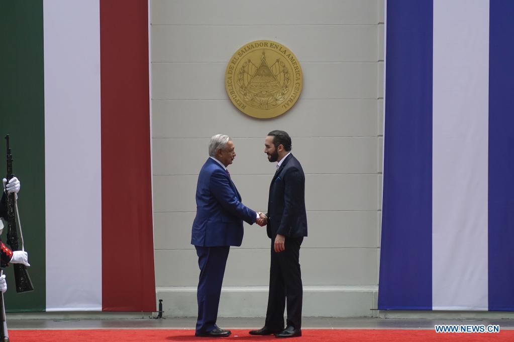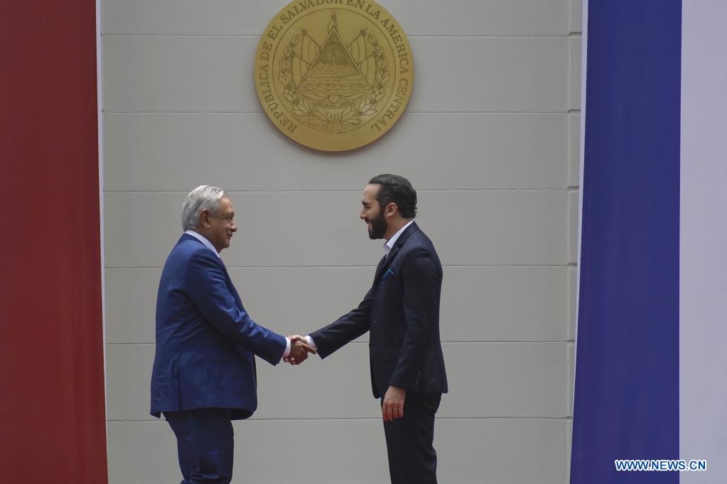 SAN SALVADOR, 6 mayo, 2022 (Xinhua) -- El presidente salvadoreño, Nayib Bukele (d), y el presidente mexicano, Andrés Manuel López Obrador (i), asisten a una ceremonia de bienvenida en la Casa Presidencial, en San Salvador, capital de El Salvador, el 6 de mayo de 2022. Bukele y López Obrador acordaron duplicar los programas mexicanos Sembrando Vida y Jóvenes Construyendo el Futuro, con los cuales se busca persuadir a la población de salir de su país para encaminarse a Estados Unidos. (Xinhua/Alexander Peña)