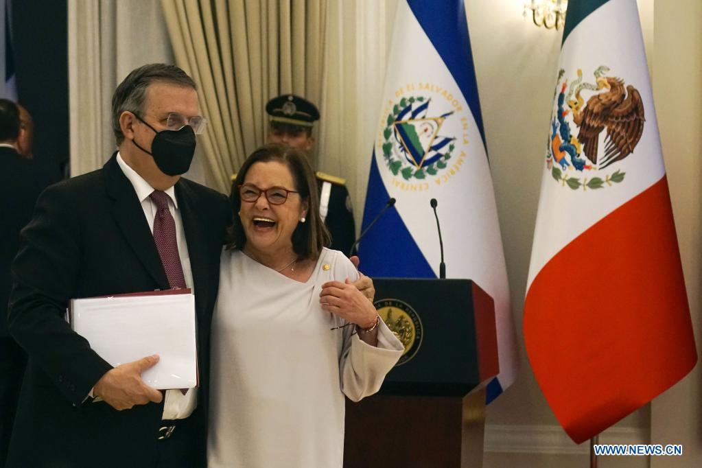 SAN SALVADOR, 6 mayo, 2022 (Xinhua) -- La canciller salvadoreña, Alexandra Hill (d) y el canciller mexicano, Marcelo Ebrard (i), reaccionan durante una ceremonia de bienvenida al presidente mexicano, Andrés Manuel López Obrador, en la Casa Presidencial, en San Salvador, capital de El Salvador, el 6 de mayo de 2022. El presidente salvadoreño, Nayib Bukele, y López Obrador acordaron duplicar los programas mexicanos Sembrando Vida y Jóvenes Construyendo el Futuro, con los cuales se busca persuadir a la población de salir de su país para encaminarse a Estados Unidos. (Xinhua/Alexander Peña)