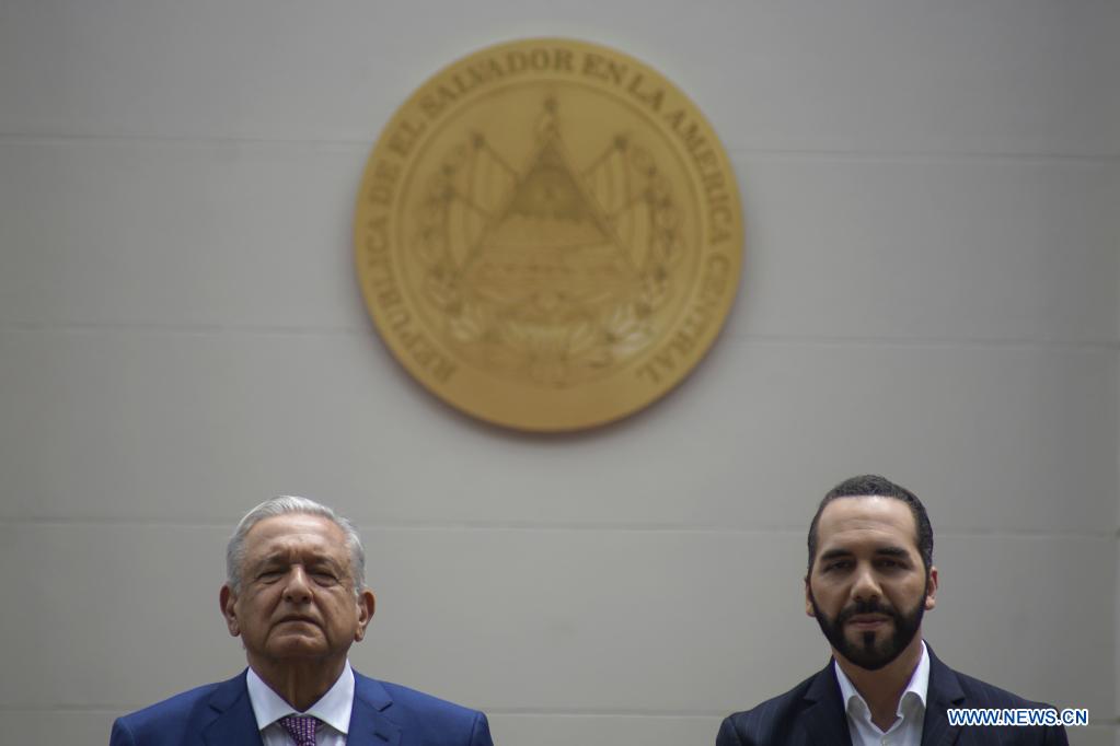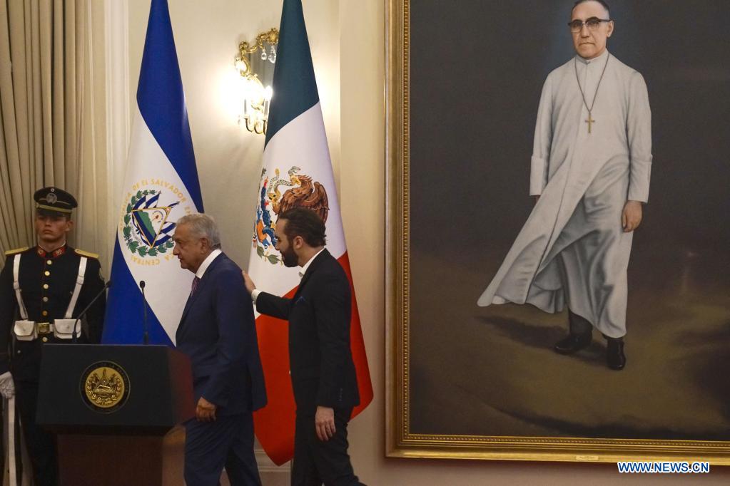 SAN SALVADOR, 6 mayo, 2022 (Xinhua) -- El presidente salvadoreño, Nayib Bukele (d), y el presidente mexicano, Andrés Manuel López Obrador (i), llegan a una ceremonia de bienvenida en la Casa Presidencial, en San Salvador, capital de El Salvador, el 6 de mayo de 2022. Bukele y López Obrador acordaron duplicar los programas mexicanos Sembrando Vida y Jóvenes Construyendo el Futuro, con los cuales se busca persuadir a la población de salir de su país para encaminarse a Estados Unidos. (Xinhua/Alexander Peña)