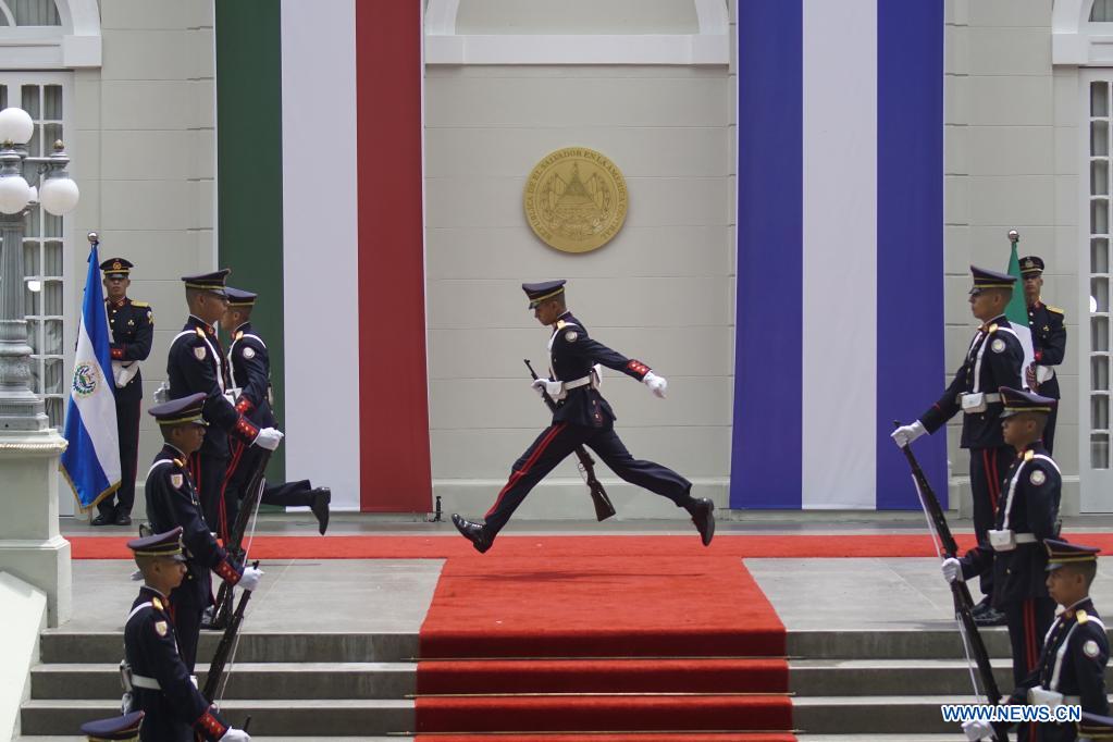 SAN SALVADOR, 6 mayo, 2022 (Xinhua) -- Elementos de la Guardia de Honor participan en una ceremonia de bienvenida al presidente mexicano, Andrés Manuel López Obrador, en la Casa Presidencial, en San Salvador, capital de El Salvador, el 6 de mayo de 2022. El presidente salvadoreño, Nayib Bukele, y el presidente mexicano, Andrés Manuel López Obrador, acordaron duplicar los programas mexicanos Sembrando Vida y Jóvenes Construyendo el Futuro, con los cuales se busca persuadir a la población de salir de su país para encaminarse a Estados Unidos. (Xinhua/Alexander Peña)