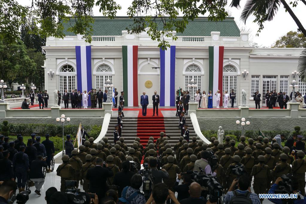 SAN SALVADOR, 6 mayo, 2022 (Xinhua) -- El presidente salvadoreño, Nayib Bukele (c-d), y el presidente mexicano, Andrés Manuel López Obrador (c-i), asisten a una ceremonia de bienvenida en la Casa Presidencial, en San Salvador, capital de El Salvador, el 6 de mayo de 2022. Bukele y López Obrador acordaron duplicar los programas mexicanos Sembrando Vida y Jóvenes Construyendo el Futuro, con los cuales se busca persuadir a la población de salir de su país para encaminarse a Estados Unidos. (Xinhua/Alexander Peña)