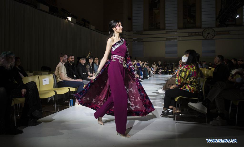 TORONTO, 8 mayo, 2022 (Xinhua) -- Imagen del 7 de mayo de 2022 de una modelo presentando una creación durante el evento de Arte de la Moda Toronto 2022 en Toronto, Canadá. (Xinhua/Zou Zheng)
