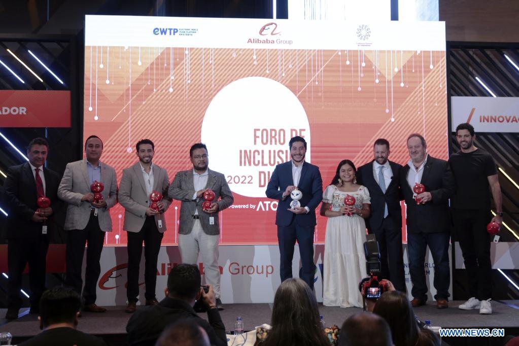 Imagen del 9 de mayo de 2022 del director general de Atomic 88 y socio de iniciativas globales para Grupo Alibaba, Andrés Díaz (c), el representante del emprendimiento mexicano para una transformación digital inclusiva, Marcus Dantus (2-d), el director de Asuntos Gubernamentales Internacionales de Grupo Alibaba en las Américas, Bill Anaya (3-d), y la promotora cultural de transformación digital inclusiva, Luz Valdez (4-d), posando durante el evento "Foro de Inclusión Digital 2022", en la Ciudad de México, capital de México. México necesita adaptar sus esquemas en el marco de la economía digital como hizo China, para no quedar rezagado ante los retos globales que ha impuesto la COVID-19, afirmaron el lunes, participantes en un foro sobre el tema celebrado en el país latinoamericano. (Xinhua/Francisco Cañedo)