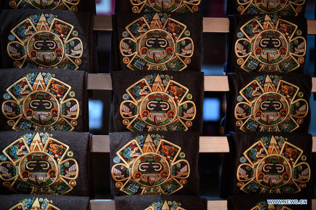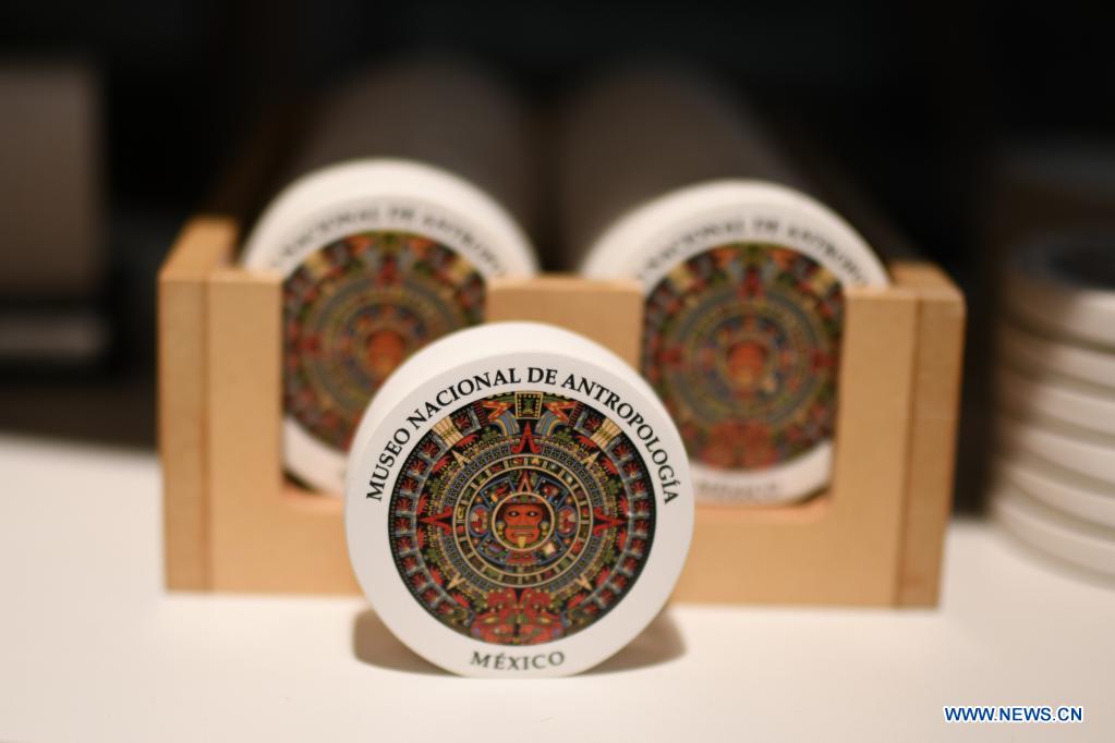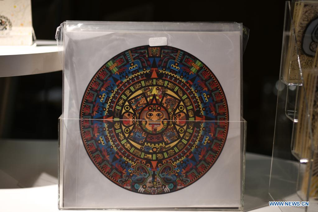 CIUDAD DE MEXICO, 15 mayo, 2022 (Xinhua) -- Imagen del 10 de mayo de 2022 de recuerdos de la Piedra del Sol en el Museo Nacional de Antropología, en la Ciudad de México, México. La Piedra del Sol destaca el papel del Sol en la creencia y religión azteca. (Xinhua/Xin Yuewei)