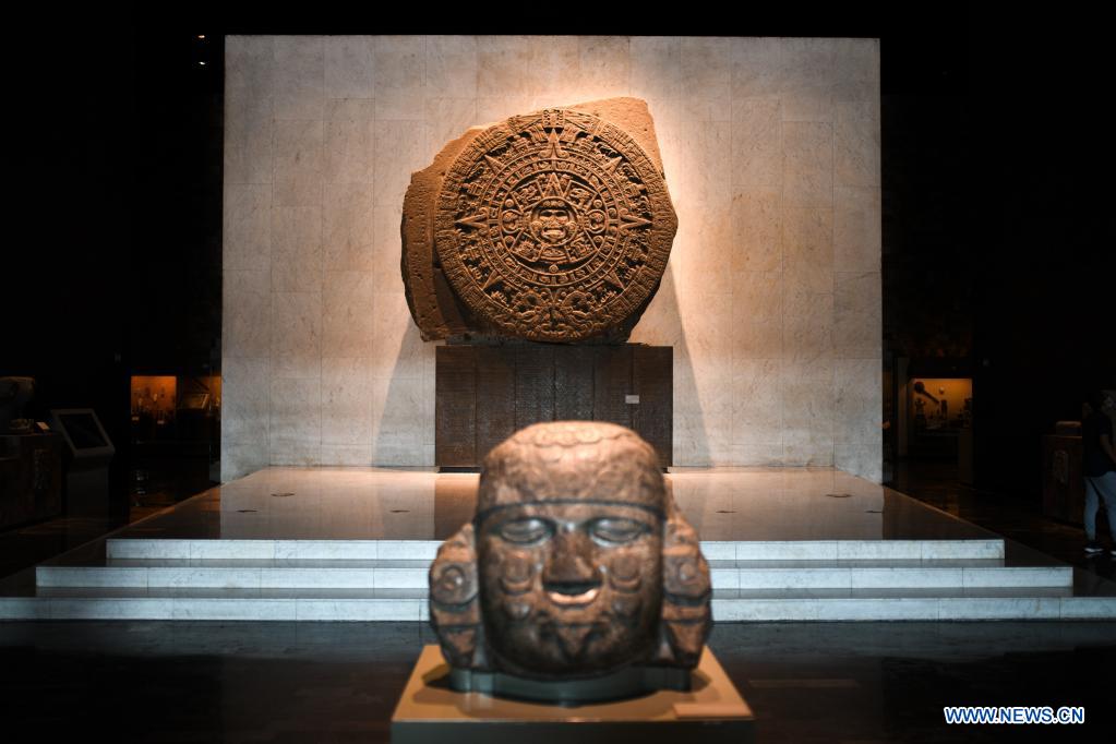 CIUDAD DE MEXICO, 15 mayo, 2022 (Xinhua) -- Imagen del 10 de mayo de 2022 de la Piedra del Sol (atrás), en el Museo Nacional de Antropología, en la Ciudad de México, México. La Piedra del Sol destaca el papel del Sol en la creencia y religión azteca. (Xinhua/Xin Yuewei)