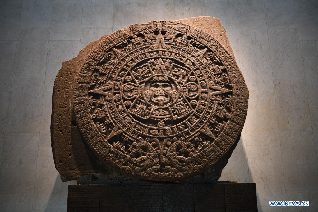CIUDAD DE MEXICO, 15 mayo, 2022 (Xinhua) -- Imagen del 10 de mayo de 2022 de la Piedra del Sol, en el Museo Nacional de Antropología, en la Ciudad de México, México. La Piedra del Sol destaca el papel del Sol en la creencia y religión azteca. (Xinhua/Xin Yuewei)