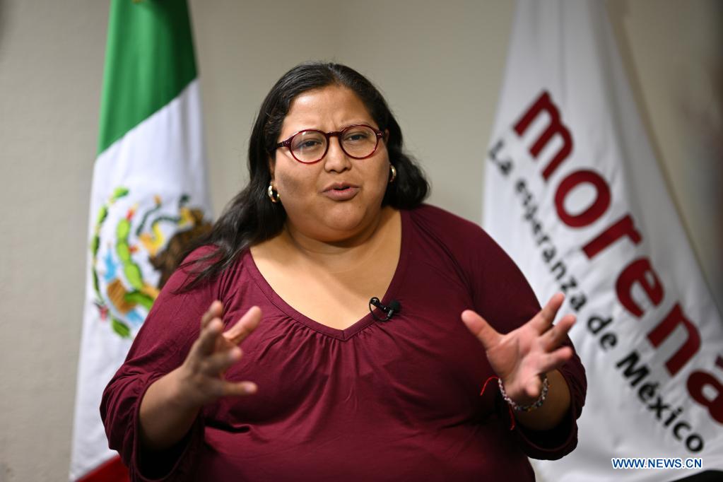 CIUDAD DE MEXICO, 20 junio, 2022 (Xinhua) -- Imagen del 17 de junio de 2022 de la secretaria general del partido Movimiento Regeneración Nacional (Morena), Citlalli Hernández Mora, hablando durante una entrevista en la Ciudad de México, capital de México. Para México no es fácil ser vecino de Estados Unidos, país acostumbrado a tratar con Gobiernos débiles que por lo general solían comportarse como los encargados del "patio trasero", pero la diferencia es que hoy en día "estamos en la lucha por nuestra soberanía", sostuvo la política mexicana Citlalli Hernández Mora. (Xinhua/Xin Yuewei)