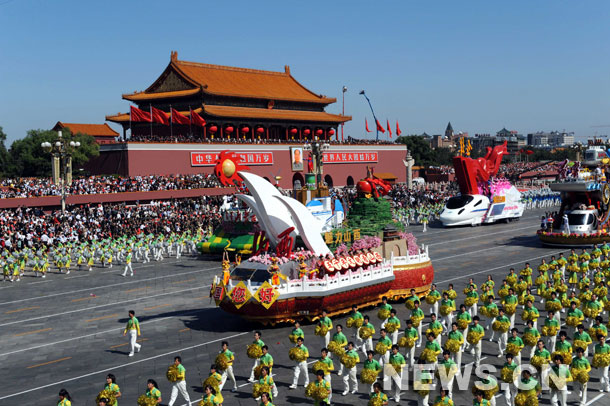 La carroza de la norteña provincia china de Shanxi marcha durante el desfile popular con motivo del 60º aniversario de la fundación de la República Popular China, en la avenida Chang'an, en el centro de Beijing, el 1 de octubre de 2009.