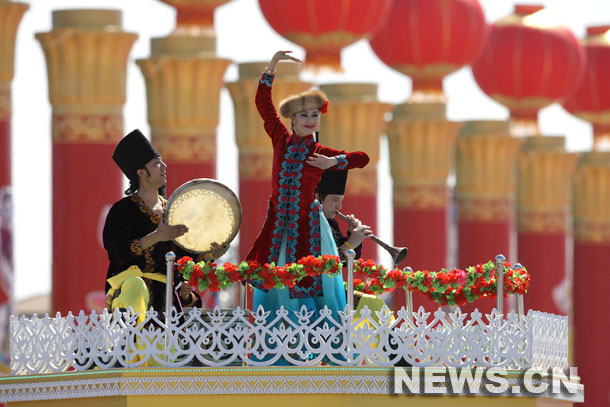 Artistas ponen en escena una obra sobre una carroza en representación de la región autónoma uygur de Xinjiang, en el noroccidente de China, durante el desfile que se celebra con motivo del 60º aniversario de la fundación de la República Popular China en la calle Chang'an, en el centro de Beijing, el 1 de octubre de 2009.