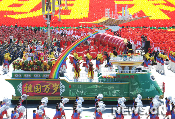 La carroza que representa la región autónoma uygur de Xinjiang (noroeste de China) marcha durante el desfile popular con motivo del 60º aniversario de la fundación de la República Popular China, en la avenida Chang'an, en el centro de Beijing, el 1 de octubre de 2009.