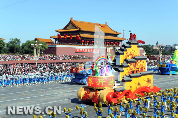 Una carroza marcha durante el desfile popular con motivo del 60º aniversario de la fundación de la República Popular China, en la avenida Chang'an, en el centro de Beijing, el 1 de octubre de 2009.