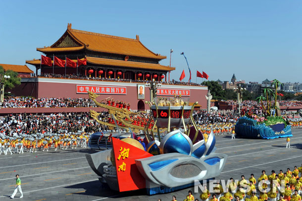 La carroza de la central provincia china de Hunan marcha durante el desfile popular con motivo del 60º aniversario de la fundación de la República Popular China, en la avenida Chang'an, en el centro de Beijing, el 1 de octubre de 2009.