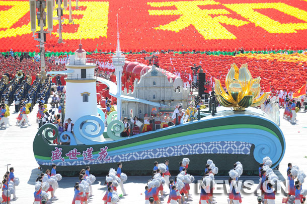 La carroza de la Región Administrativa Especial de Macao marcha durante el desfile popular con motivo del 60º aniversario de la fundación de la República Popular China, en la avenida Chang'an, en el centro de Beijing, el 1 de octubre de 2009.