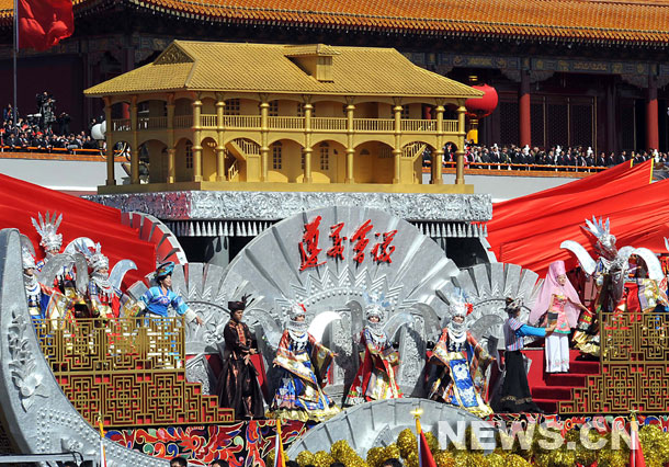 La carroza de la suroccidental provincia china de Guizhou marcha durante el desfile popular con motivo del 60º aniversario de la fundación de la República Popular China, en la avenida Chang'an, en el centro de Beijing, el 1 de octubre de 2009.