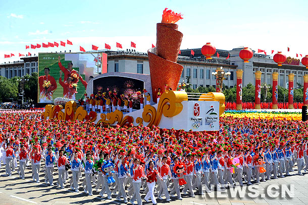 Una carroza que representa los Juegos Olímpicos de Beijing 2008 participa el 1 de octubre de 2009 en el desfile popular celebrado en el centro de la capital para conmemorar el 60º aniversario de la fundación de la República Popular China.