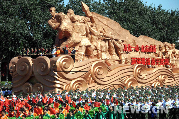 Esta imagen muestra una de las carrozas que participaron el 1 de octubre de 2009 en un desfile popular celebrado en el centro de Beijing para conmemorar del 60º aniversario de la fundación de la República Popular China.