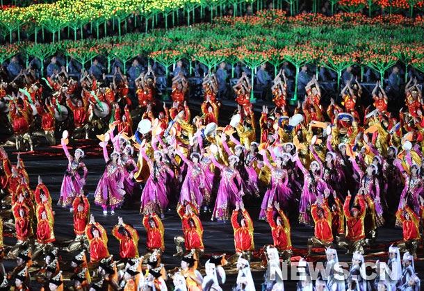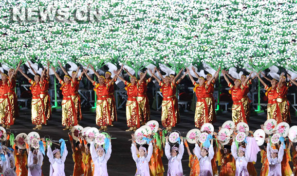 En la parte central de la Plaza de Tian'anmen, unos 4.000 artistas, formando un enorme cuadrado, agitaron grandes ramos de peonía y formaron nudos chinos con un aparato electrónico en forma de árbol que cada uno de ellos tenía en sus manos. Con el cambio de la melodía, las flores y los nudos fueron repentinamente reemplazados por un océano de cintas rojas.