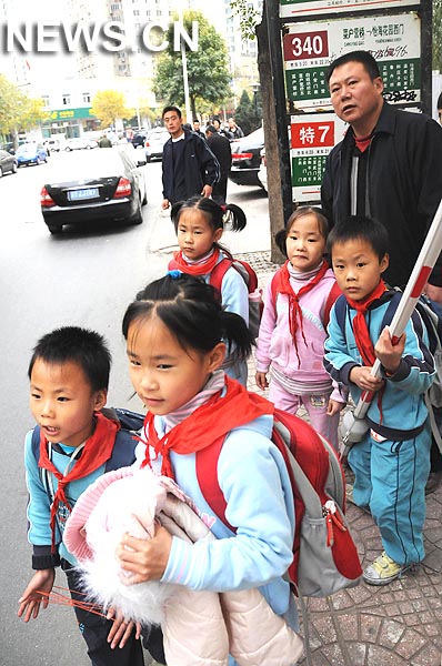 Los quitillizos de la pareja Jiao Baocun y Wang Cuiying, de la septentrional provincia china de Hebei, esperan al autobús con su padre, en Beijing.