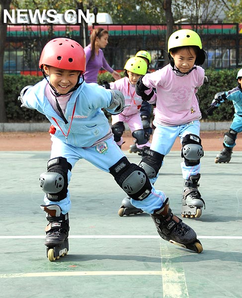 Los quitillizos de la pareja Jiao Baocun y Wang Cuiying, de la septentrional provincia china de Hebei, patinan sobre ruedas en la Escuela Experimental Primaria del distrito Fengtai de Beijing.