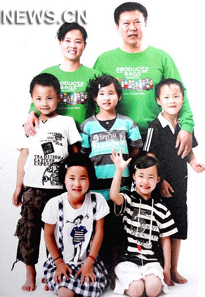 Fotografía familiar, tomada el 30 de octubre de 2009, muestra a los quitillizos junto a la pareja Jiao Baocun y Wang Cuiying, de la septentrional provincia china de Hebei.