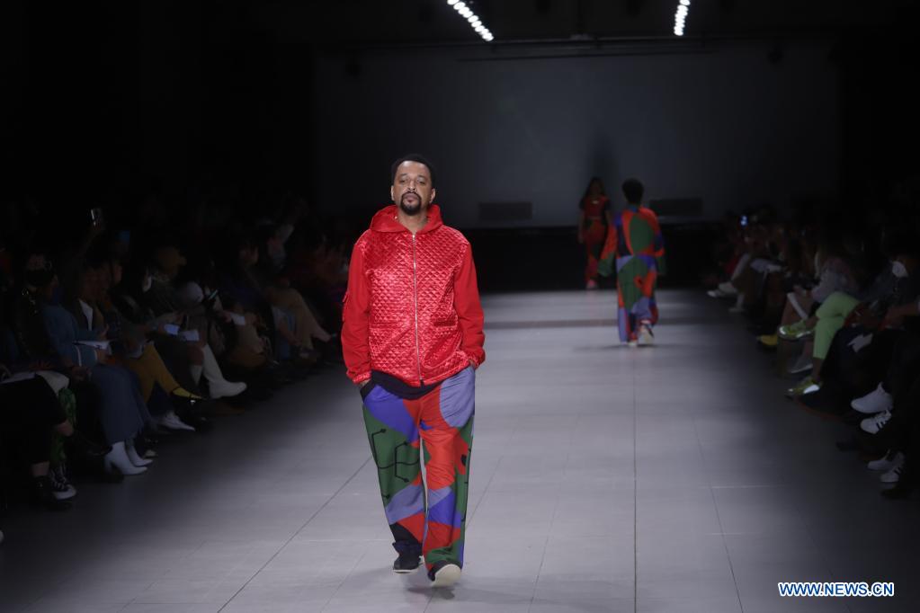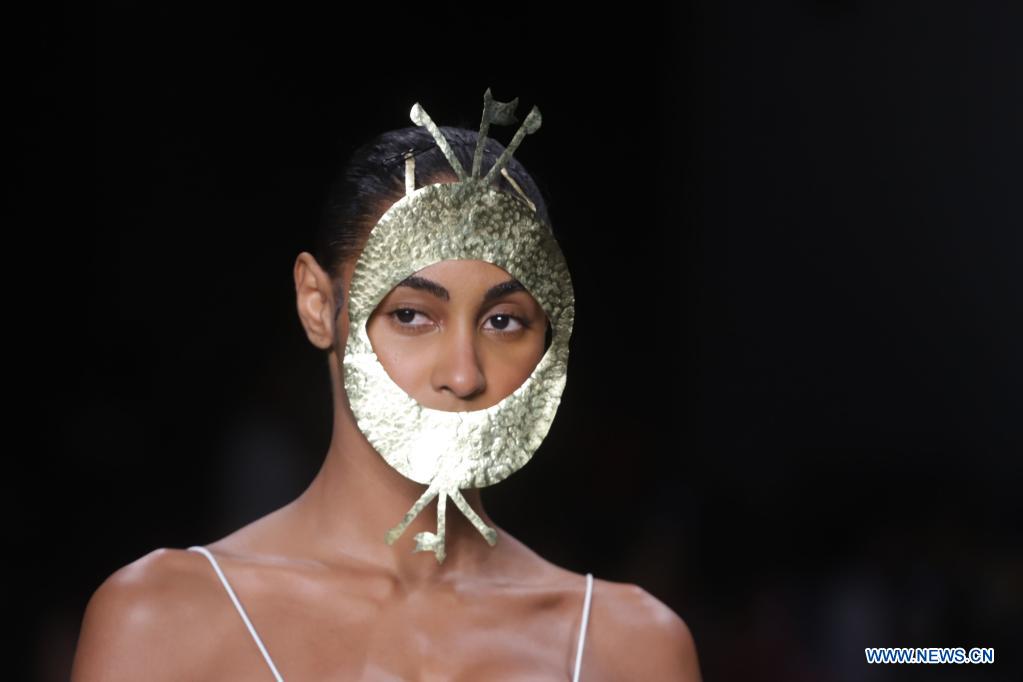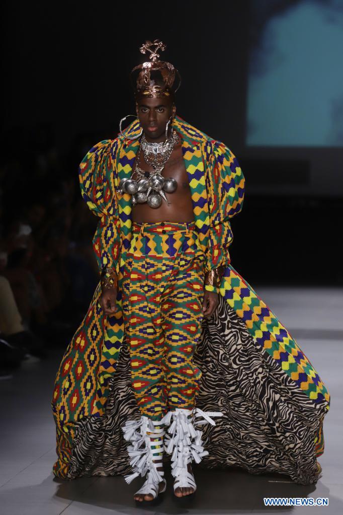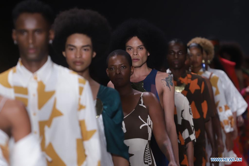 SAO PAULO, 3 junio, 2022 (Xinhua) -- Un modelo presenta una creación de Sankofa del diseñador Rafael Silvério durante la Semana de la Moda de Sao Paulo, en Sao Paulo, Brasil, el 3 de junio de 2022. (Xinhua/Rahel Patrasso)