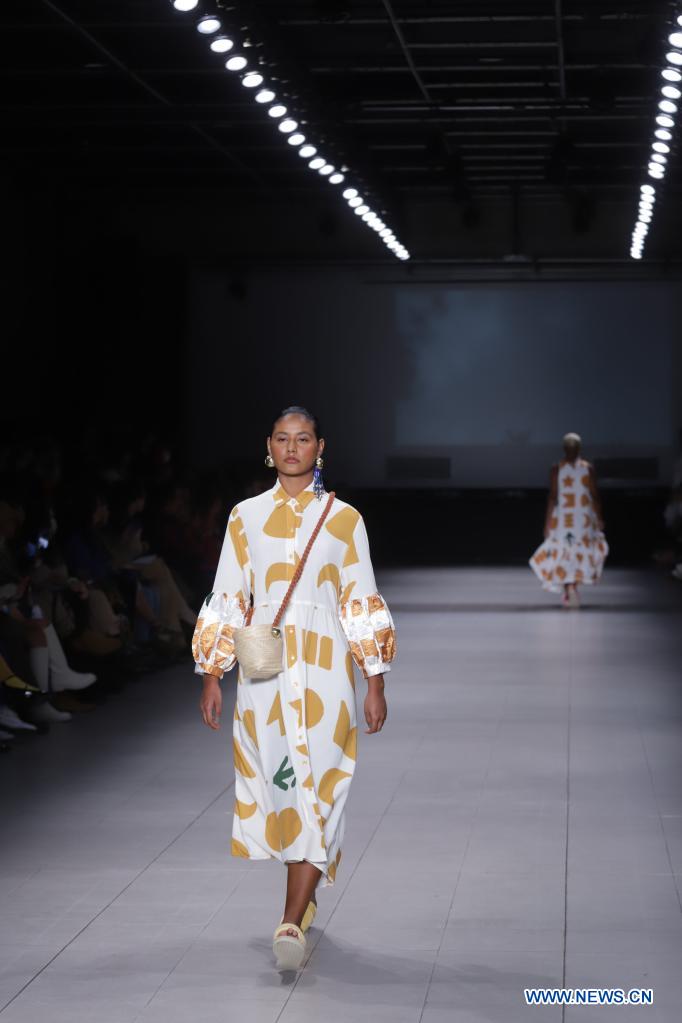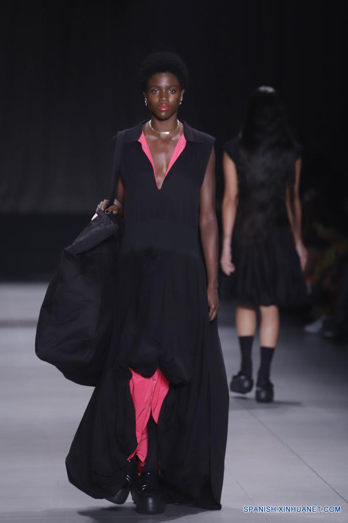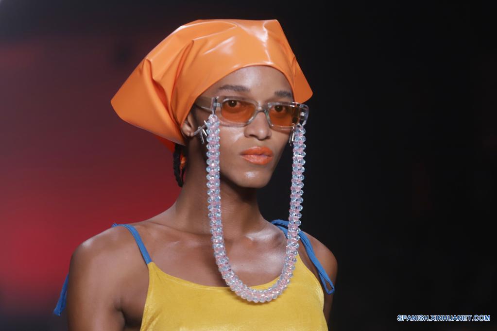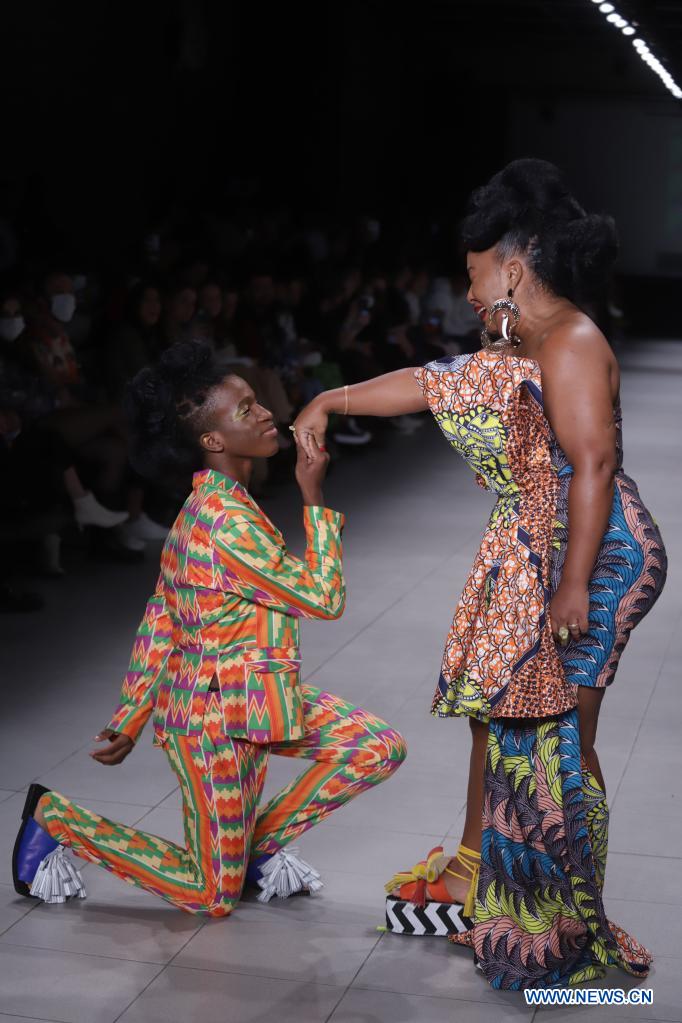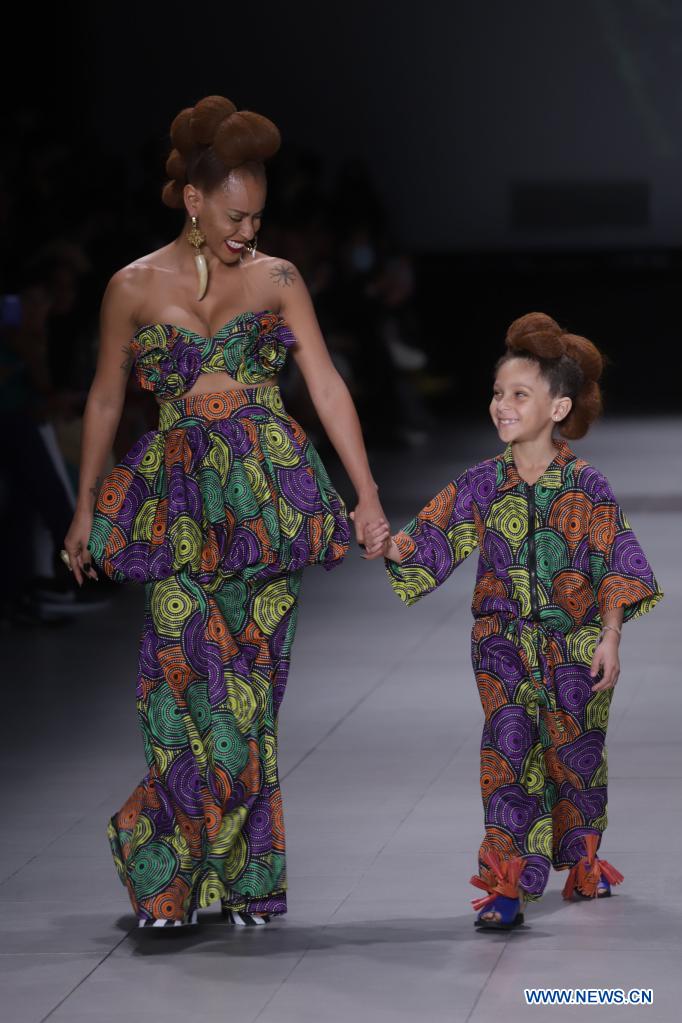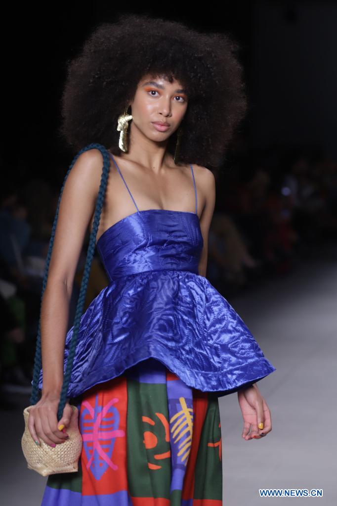 SAO PAULO, 3 junio, 2022 (Xinhua) -- Una modelo presenta una creación de Sankofa del diseñador Rafael Silvério durante la Semana de la Moda de Sao Paulo, en Sao Paulo, Brasil, el 3 de junio de 2022. (Xinhua/Rahel Patrasso)