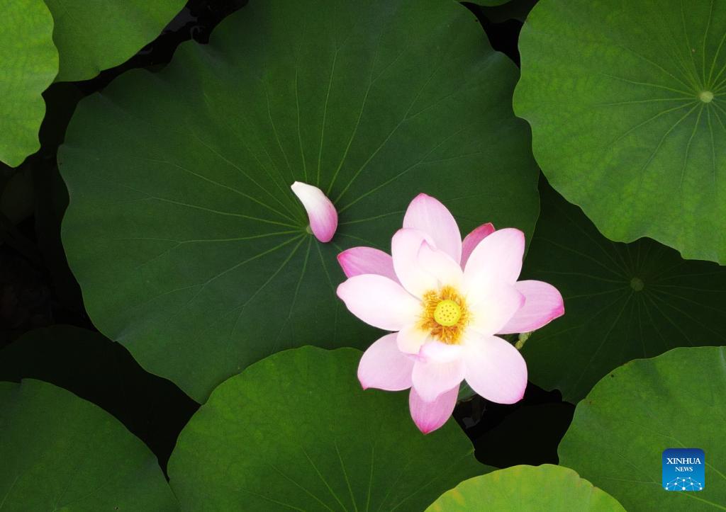 YANGZHOU, 12 junio, 2022 (Xinhua) -- Vista aérea del 12 de junio de 2022 de una flor de loto, en Yangzhou, provincia de Jiangsu, en el este de China. (Xinhua/Meng Delong)