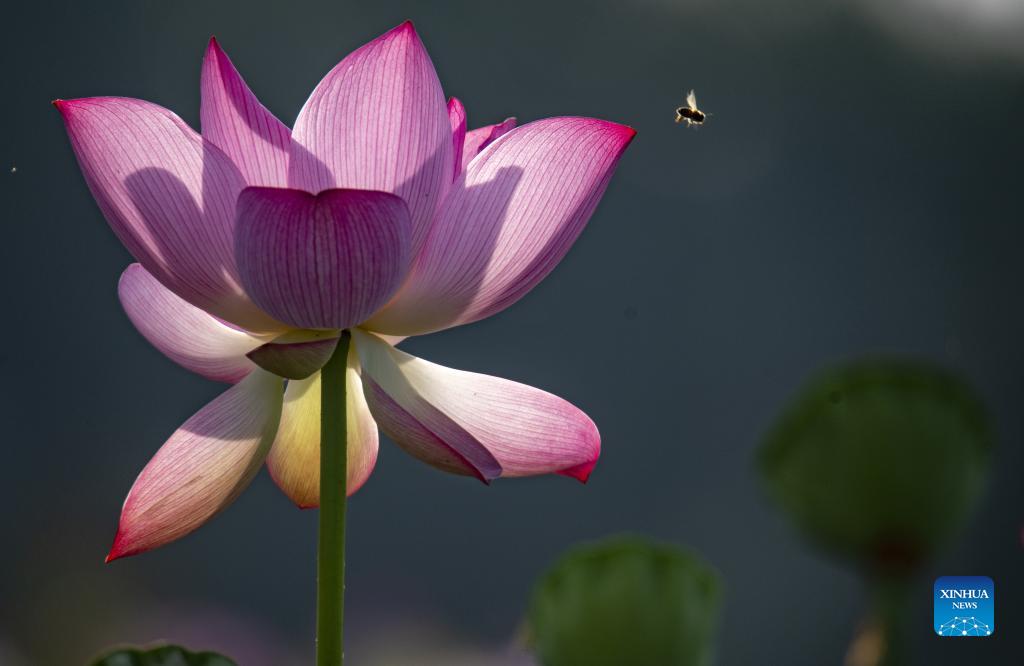 XIANGXI, 12 junio, 2022 (Xinhua) -- Una abeja se acerca a una flor de loto, en la aldea de Siping, en el distrito de Longshan, prefectura autónoma de las etnias tujia y miao de Xiangxi, en la provincia de Hunan, en el centro de China, el 12 de junio de 2022. (Xinhua/Zeng Xianghui)