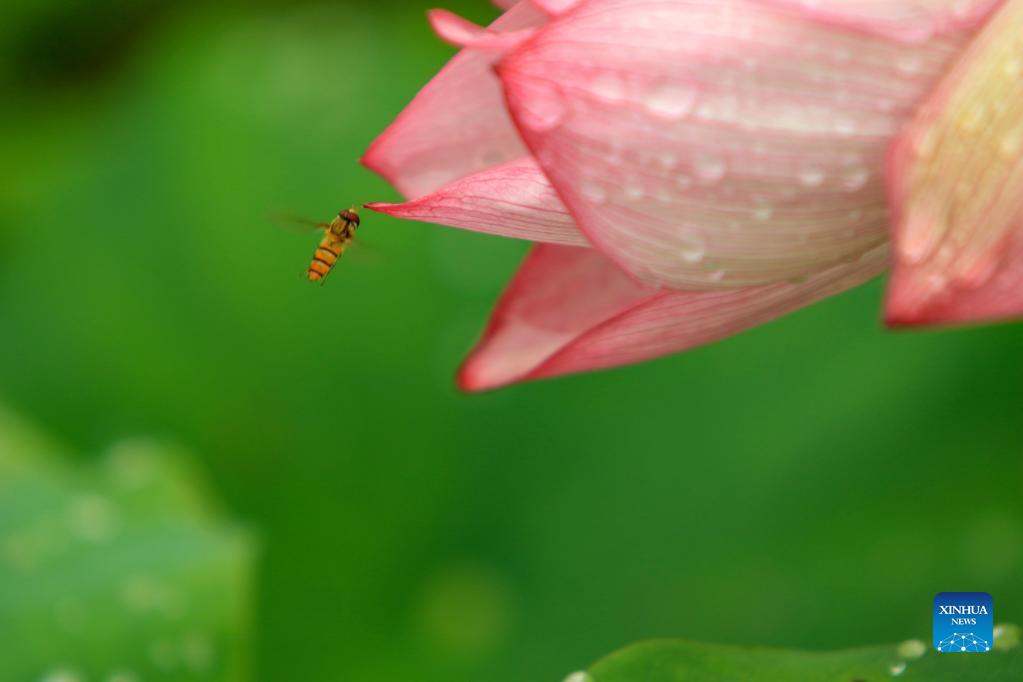 QIONGHAI, 12 junio, 2022 (Xinhua) -- Una abeja se acerca a una flor de loto, en el municipio de Tayang, en la ciudad de Qionghai, provincia de Hainan, en el sur de China, el 12 de junio de 2022. (Xinhua/Meng Zhongde)