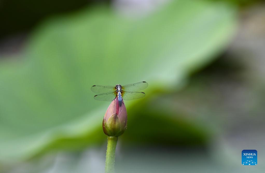 TENGZHOU, 12 junio, 2022 (Xinhua) -- Una libélula se posa en un capullo de loto, en Tengzhou, provincia de Shandong, en el este de China, el 12 de junio de 2022. (Xinhua/Li Zhijun)