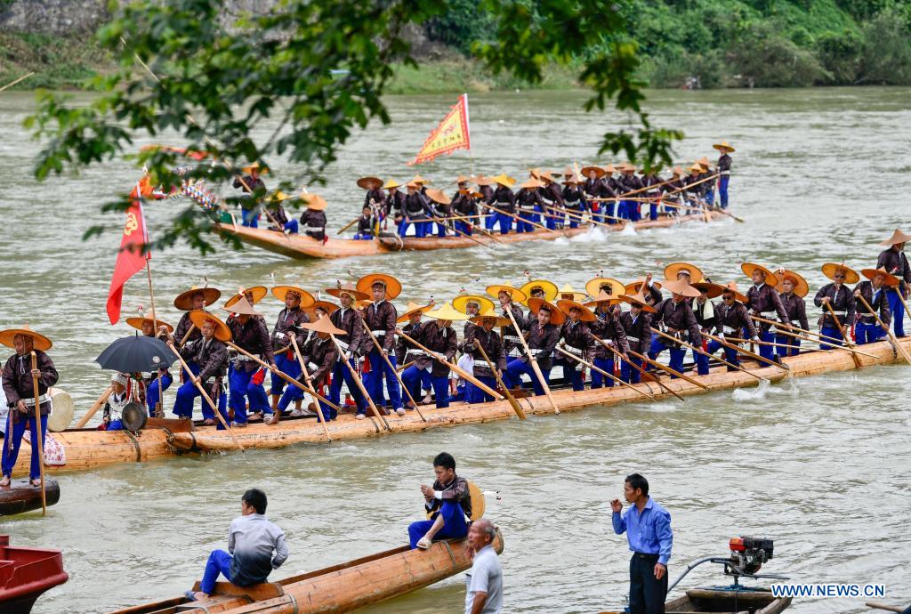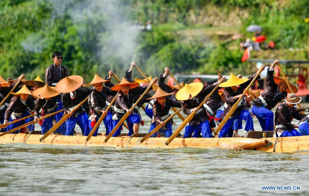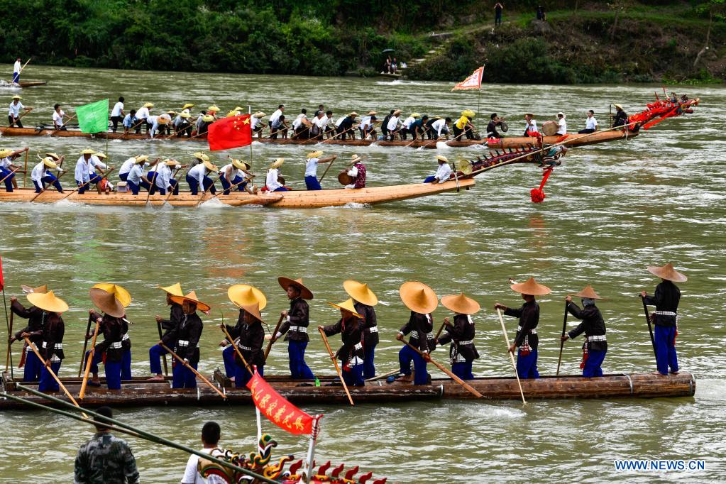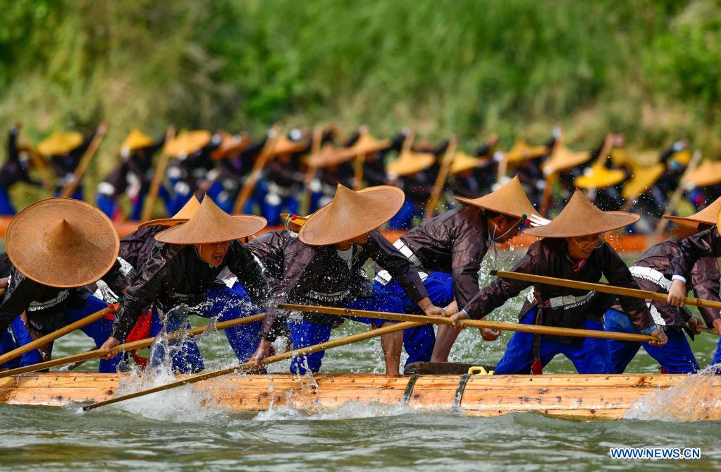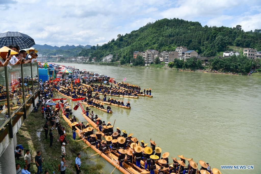 TAIJIANG, 24 junio, 2022 (Xinhua) -- Imagen del 23 de junio de 2022 de personas de la etnia miao participando en el festival del bote del dragón en canoa, en el poblado de Shidong, en el distrito de Taijiang de la provincia de Guizhou, en el suroeste de China. El jueves se celebró el festival del bote del dragón en canoa anual de la etnia miao. (Xinhua/Yang Wenbin)