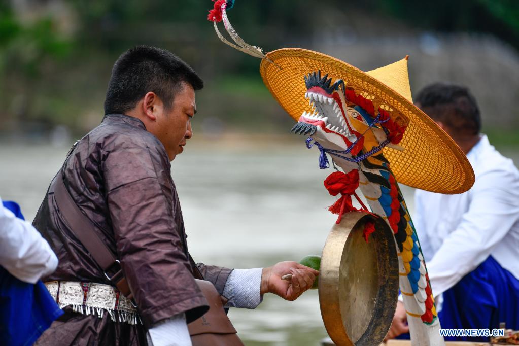 TAIJIANG, 24 junio, 2022 (Xinhua) -- Imagen del 23 de junio de 2022 de un hombre de la etnia miao golpeando un gong durante el festival del bote del dragón en canoa, en el poblado de Shidong, en el distrito de Taijiang de la provincia de Guizhou, en el suroeste de China. El jueves se celebró el festival del bote del dragón en canoa anual de la etnia miao. (Xinhua/Yang Wenbin)