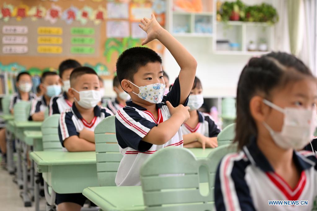BEIJING, 27 junio, 2022 (Xinhua) -- Un niño levanta la mano para responder a una pregunta en la Escuela Yuquan adjunta a la Universidad Normal de la Capital, en Beijing, capital de China, el 27 de junio de 2022. Los estudiantes de escuelas primarias y secundarias de Beijing regresaron al campus el lunes después de más de 50 días de educación remota debido al resurgimiento local de la COVID-19. Los estudiantes de los primeros dos años de secundaria y preparatoria, o grados 7, 8, 10 y 11, así como los de escuelas primarias, retomaron las clases presenciales. La educación para estudiantes en los grados 9 y 12 concluyó previamente. (Xinhua/Li Xin)