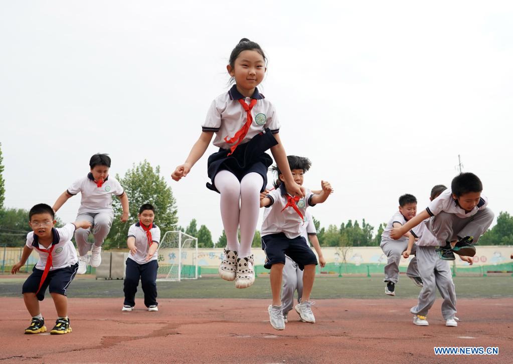 BEIJING, 27 junio, 2022 (Xinhua) -- Estudiantes toman una clase de educación física en el campus de Pinggu de la Escuela Primaria Experimental No. 2 de Beijing, en Beijing, capital de China, el 27 de junio de 2022. Los estudiantes de escuelas primarias y secundarias de Beijing regresaron al campus el lunes después de más de 50 días de educación remota debido al resurgimiento local de la COVID-19. Los estudiantes de los primeros dos años de secundaria y preparatoria, o grados 7, 8, 10 y 11, así como los de escuelas primarias, retomaron las clases presenciales. La educación para estudiantes en los grados 9 y 12 concluyó previamente. (Xinhua/Ren Chao)