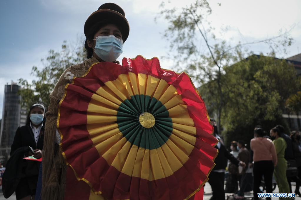 LA PAZ, 14 julio, 2022 (Xinhua) -- Una maestra de la Escuela Técnica Berlín participa en un desfile escolar llevado a cabo por el 213 aniversario de la gesta libertadora del departamento de La Paz del 16 de julio de 1809, en La Paz, Bolivia, el 14 de julio de 2022. (Xinhua/Mateo Romay)