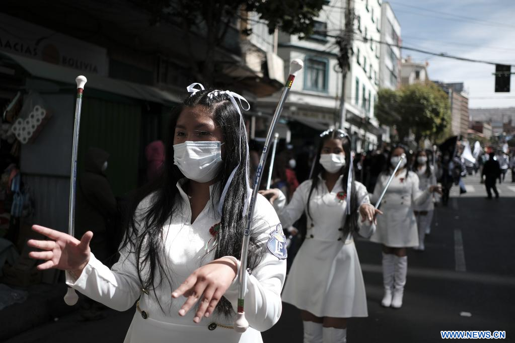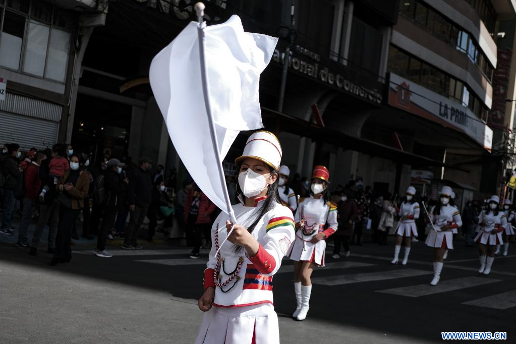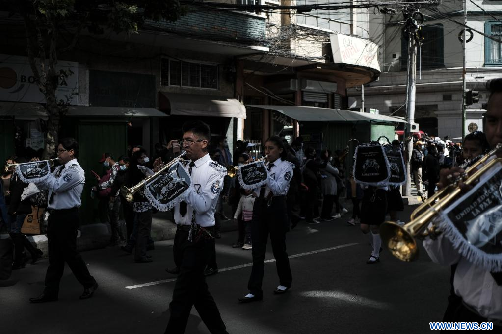 LA PAZ, 14 julio, 2022 (Xinhua) -- Estudiantes del Colegio German Busch participan en un desfile escolar llevado a cabo por el 213 aniversario de la gesta libertadora del departamento de La Paz del 16 de julio de 1809, en La Paz, Bolivia, el 14 de julio de 2022. (Xinhua/Mateo Romay)