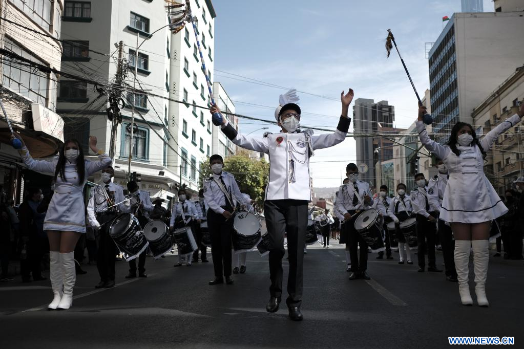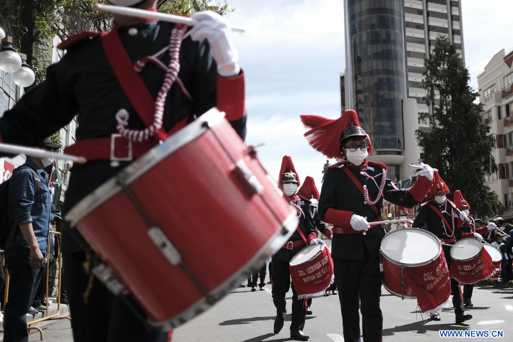 LA PAZ, 14 julio, 2022 (Xinhua) -- Integrantes de la banda de música de la Unidad Educativa La Paz participan en un desfile escolar llevado a cabo por el 213 aniversario de la gesta libertadora del departamento de La Paz del 16 de julio de 1809, en La Paz, Bolivia, el 14 de julio de 2022. (Xinhua/Mateo Romay)